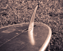 The thruster setup can be arranged a few ways. The most common is to have three equal sized fins set up in a triangular pattern with the center one closest to the back of the board. The two side fins are placed about a foot from the tail and an inch from the rail. The center fin is typically a double foiled fin while the two side fins are asymmetrically foiled with the flat side on the inside. They will both point slightly inward towards the nose of the board.